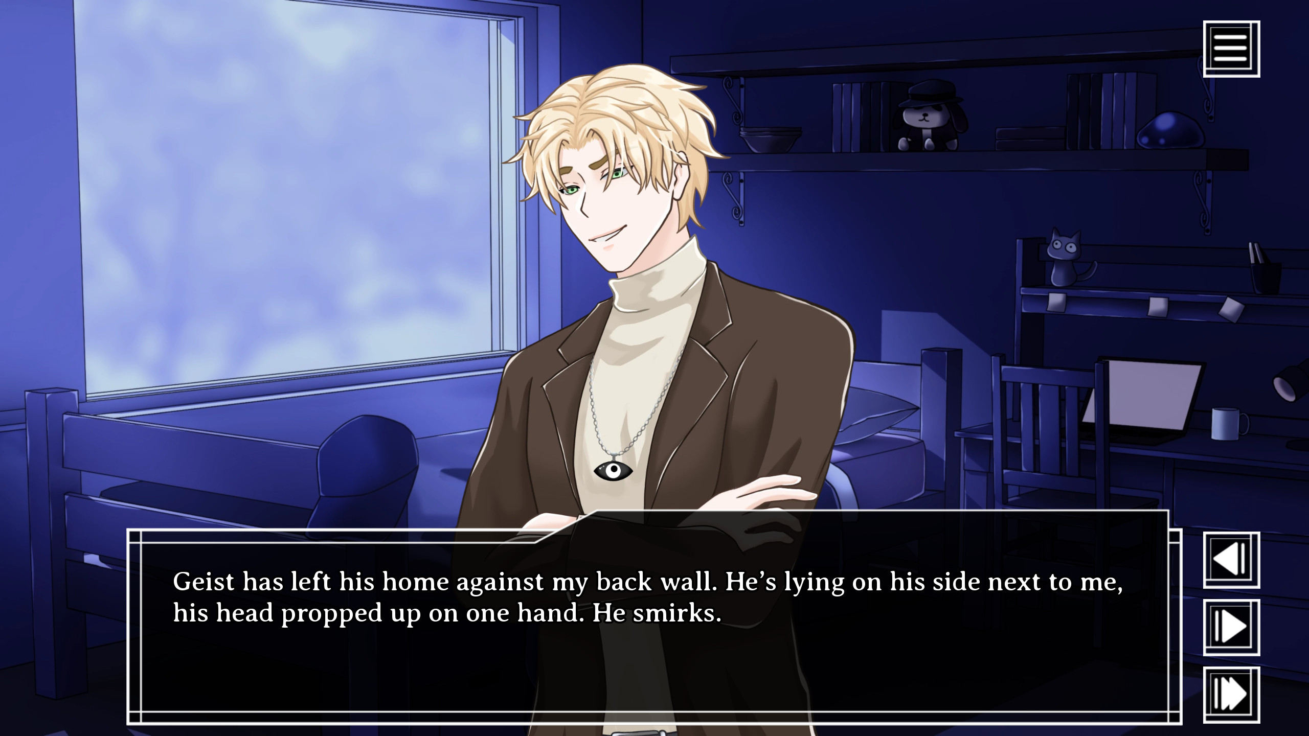 I like the use of the VAs, I know that there are realistically only two VAs because of the relevancy of Geist and Kalei but I like to think MC can only "hear" these two characters because of the amount of impact they have. Like, Geist's voice being all smooth and his tendency to enunciate words really makes you focus on him and his slow cadence, like he drowns out everything that you don't put in any audio in the background signifying the outside world because MC has gotten used to desperately trying to block out Geist's words that, by consequence, they've blocked and isolated themselves from hearing the outside world as well.