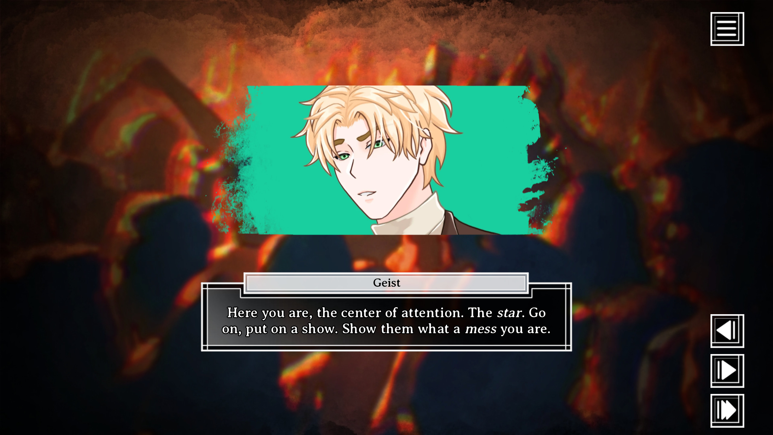 Geist is obviously a manifestation of the protagonists insecurities, and I can understand that voice of derision and doubt. Thank you for the kind words at the end of the game. You are really sweet to say that.